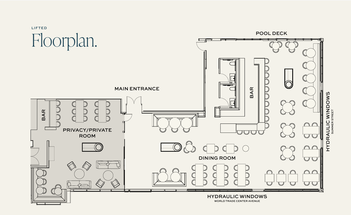 Reserve your very own portion of Lifted and enjoy abundant natural light in a roped-off private space. It’s giving… VIP vibes. Up to 125ppl.